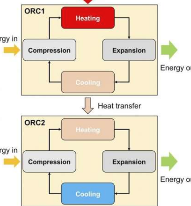 级联ORC系统实质上是两个ORC系统耦合在一起,从第一个ORC排出的热量被用作第二个ORC的输入热量。