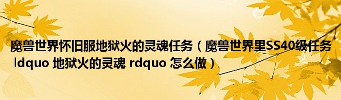 关于魔兽世界怀旧服地狱火的灵魂任务,魔兽世界里SS40级任务 ldquo 地狱火的灵魂 rdquo 怎么做这个很多人还不知道,今天菲菲来为大家解答以上的问题,现在让我们一起来看看吧!
